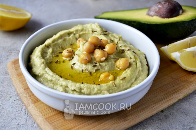 Полейте хумус оливковым маслом, положите несколько горошин вареного нута, который мы оставляли до измельчения, посыпьте по вкусу зирой. Ароматная и очень вкусная закуска из нута и авокадо готова к подаче.
