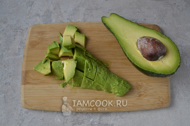Авокадо вымойте, разрежьте пополам. Половину плода нарежьте кусочками.