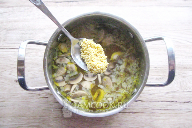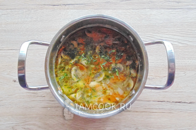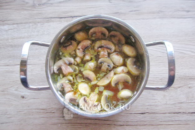 После добавьте морковь с луком в кастрюлю. Шампиньоны очистите, помойте и нарежьте. Выложите в суп.