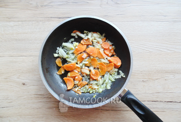 Репчатый лук и морковь очистите, помойте и нарежьте не очень крупно. Морковь можно натереть на терке. Выложите в сковороду. Добавьте сливочное масло и пассеруйте овощи 4-5 минут.