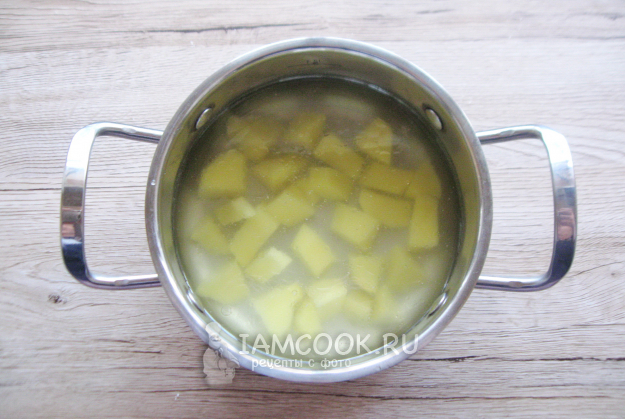 Картофель очистите, помойте и нарежьте. Выложите в кастрюлю с бульоном. Начинайте варить суп.