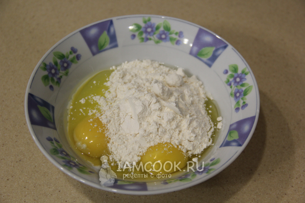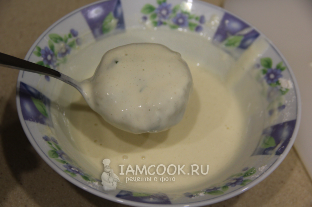 Для кляра соединить сметану, яйца и муку. Посолить кляр по вкусу и тщательно перемешать венчиком до однородного состояния.