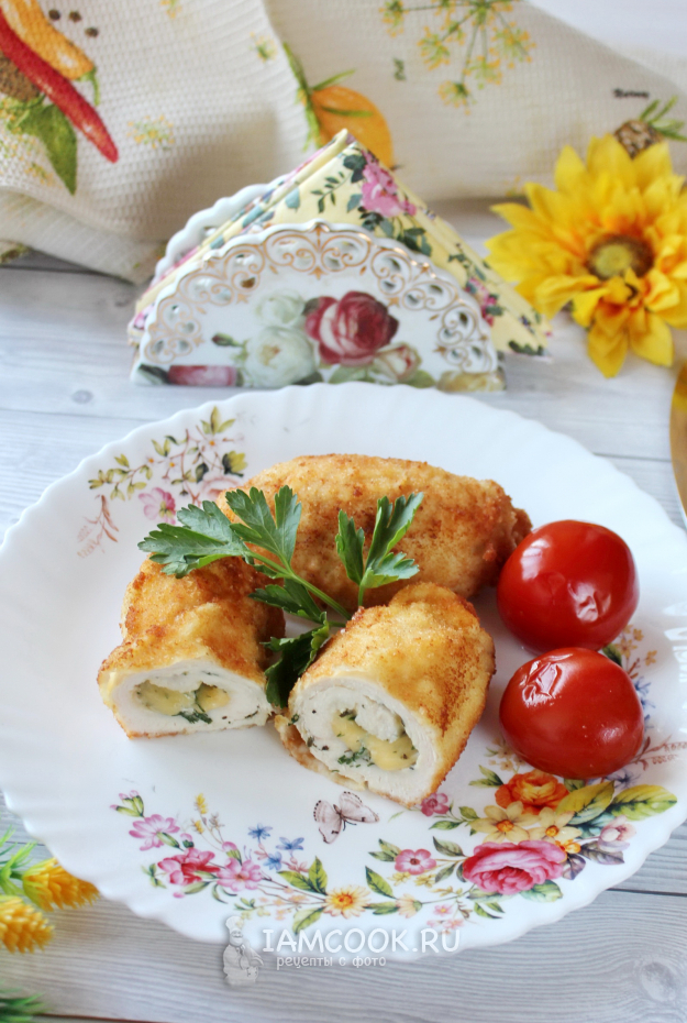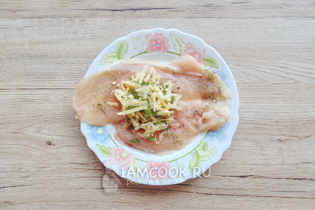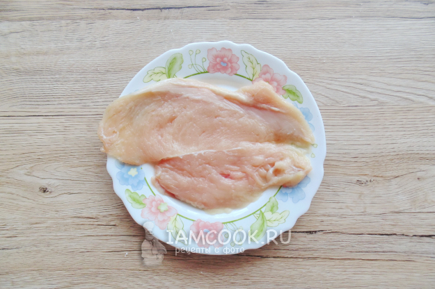 Куриную грудку нарежьте пластами. Немного отбейте каждый пласт.