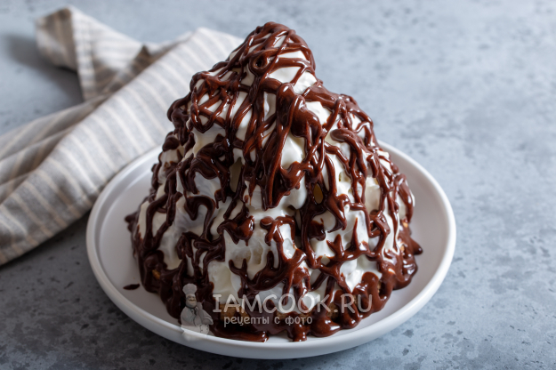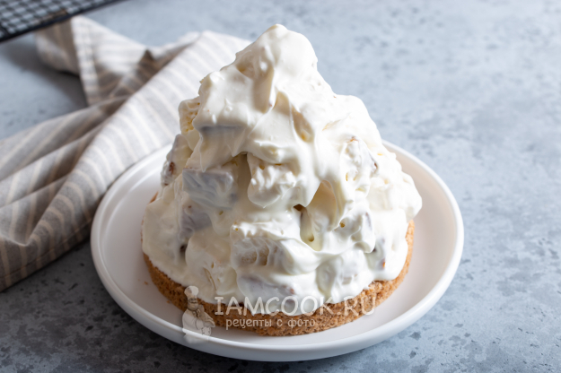 Так выкладывайте все нарезанные кусочки по кругу, сужая в верхушке, образуя конус. Готовый торт уберите в холодильник.