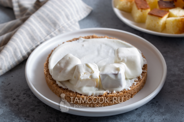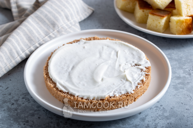 Каждый нарезанный кусочек белого бисквита окунайте в крем и выкладывайте на основу по кругу.