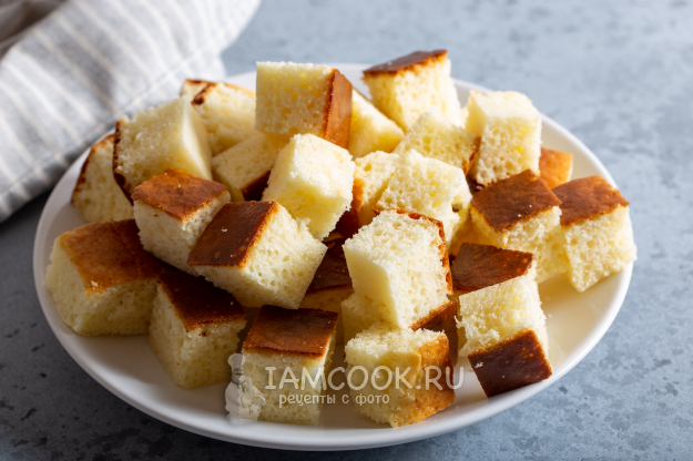 Когда бисквиты остынут, нарежьте их. Белый бисквит - на кубики. Но учтите, что румяную корочку от верха будет отчётливо видно в готовом торте, поэтому если это смущает, то верхушку лучше срезать.