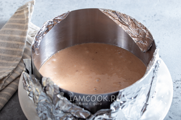 Тесто разделите на две части в соотношении где-то 2/3 и 1/3. В меньшую часть добавьте какао и перемешайте - это основа торта. Влейте её в форму поменьше.
