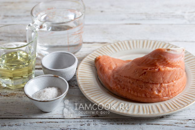 Подготовьте указанные ингредиенты для засолки горбуши в рассоле кусочками. Обычно в магазине продаётся замороженная рыба. Чтобы легче её в дальнейшем нарезать, не размораживайте филе полностью. Растительное масло я взяла подсолнечное рафинированное.