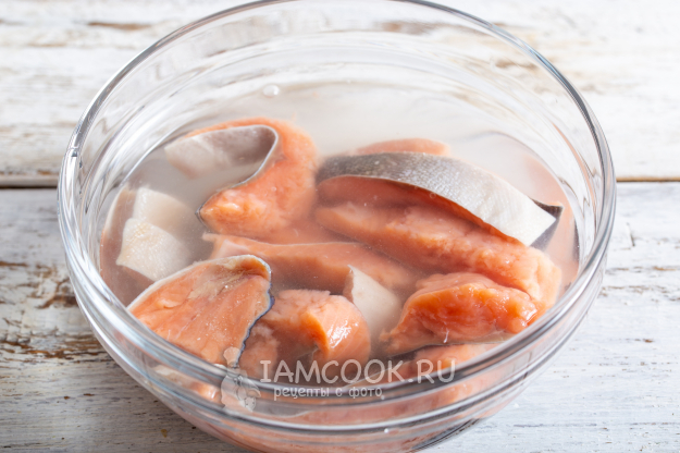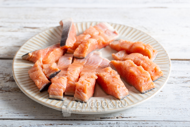 Горбушу очистите и промойте, удалите кости. Нарежьте на небольшие порционные кусочки. Шкурку лучше не срезайте, так рыба будет лучше держать форму.