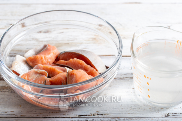 Выложите нарезанную рыбу в глубокую миску. В кипячёной воде комнатной температуры растворите соль и сахар.