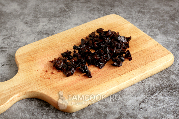 Чернослив несколько раз промойте горячей водой, залейте чистой горячей водой, оставьте на 15 минут, затем слейте воду, а чернослив мелко нарежьте.