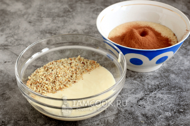 Получившееся тесто разделите пополам. Я это сделала с помощью весов. В одну часть добавьте по рецепту какао, а в другую - измельченные грецкие орехи. Аккуратно перемешайте до однородности.