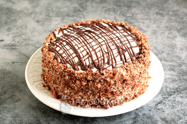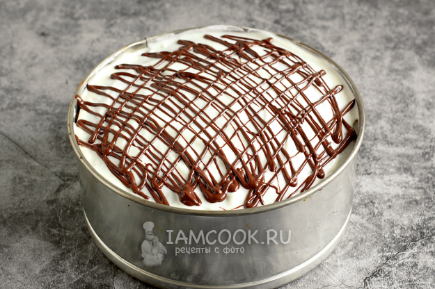 Верхний корж слегка смажьте кремом и украсьте по желанию. Мне захотелось полить торт шоколадом, предварительно растопив его в микроволновке короткими импульсами. Поставьте форму с тортом в холодильник на пару часов или в морозилку на 20 минут.