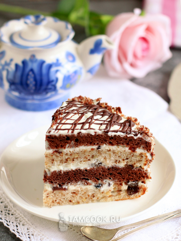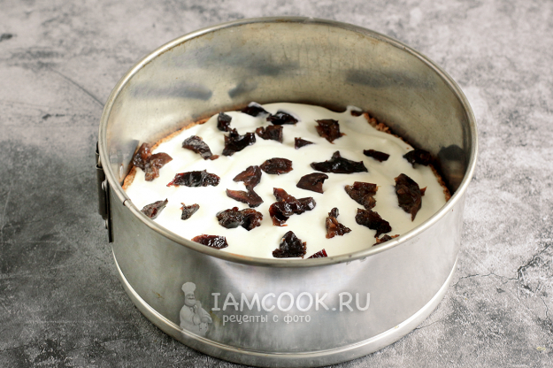 Начните собирать торт в кольце от формы, чтобы он при сборке не разъезжался. Каждый корж смазывайте кремом и выкладывайте чернослив. Чередуйте светлый и темный коржи. Немного крема оставьте для смазывания боков торта.