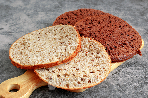По очереди испеките два коржа, если форма у вас одна. Дно формы прокладывайте силиконизированным пергаментом или слегка смазывайте маслом и посыпайте мукой. Бортики смазывать маслом не нужно.