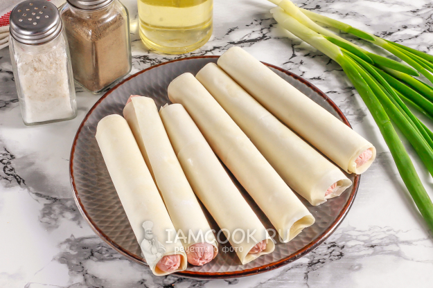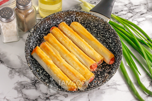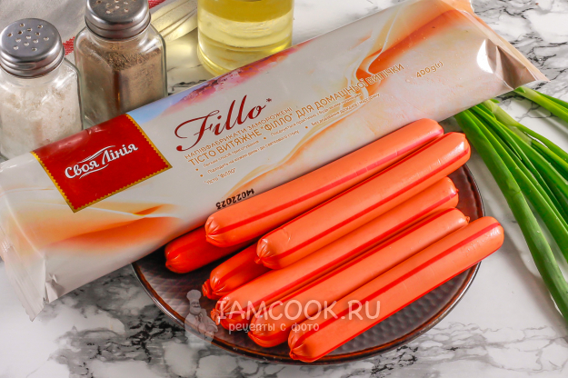 Возьмите необходимые ингредиенты для приготовления аппетитных сосисок в тесте фило на сковороде. Сорт сосисок не столь важен - выбирайте по своему вкусу.