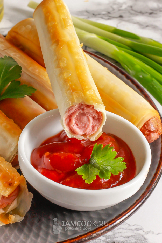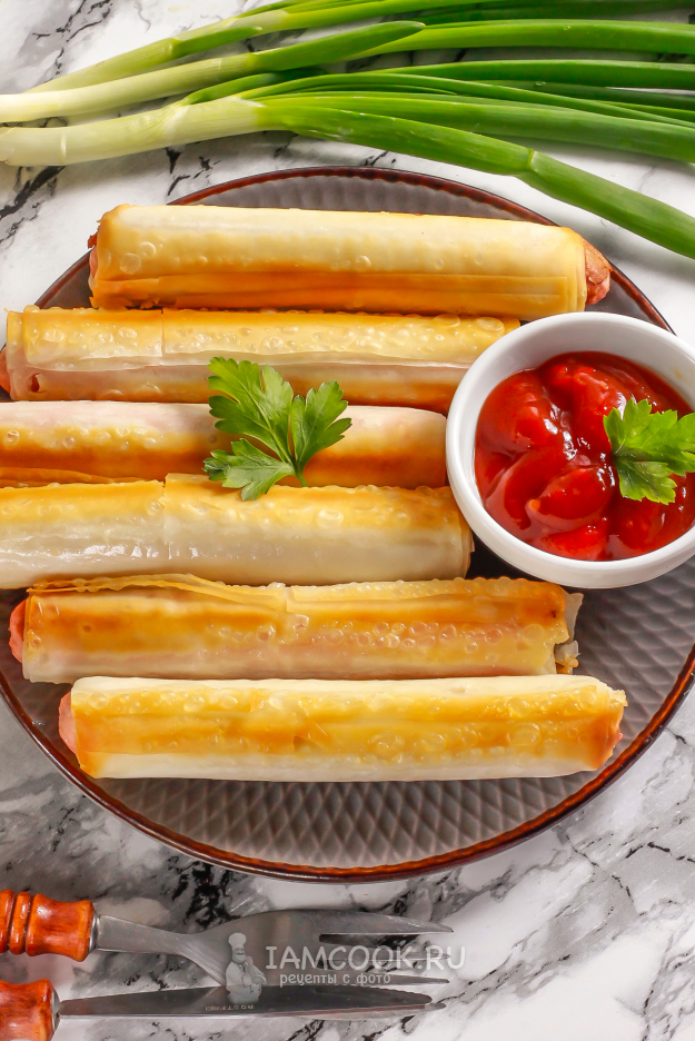 Готовые румяные сосиски в тесте фило выложите на тарелку и подайте к столу теплыми с различными соусами.