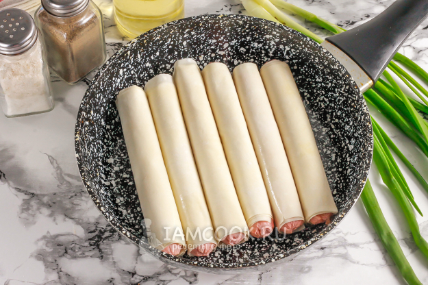 Прогрейте на сковороде растительное или сливочное растопленное масло и выложите в него сосиски в тесте. Убавьте нагрев до умеренного и обжарьте примерно 1-2 минуты.