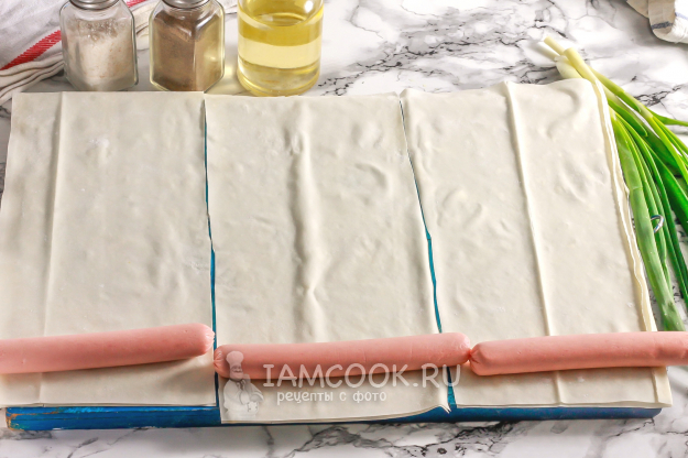Два листа теста разверните на рабочей поверхности или доске, сосиски очистите от оболочки. По ширине сосисок нарежьте лентами тесто. Я не смазывала листы теста между собой ничем, но вы можете это сделать с помощью масла, соуса и т.д. На этом этапе также можно присыпать тесто различными измельченными специями или пряностями.