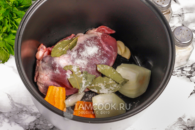 Очищенные половинки лука и моркови нарежьте крупно и выложите в кастрюлю или чашу мультиварки. Добавьте туда же пару очищенных зубчиков чеснока и сердце.