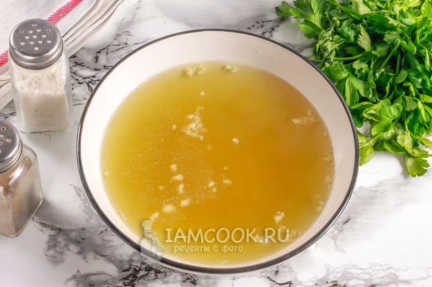 Затем необходимую часть бульона процедите через ситечко или двойной слой марли в глубокую емкость. Спрессуйте в бульон оставшиеся очищенные зубчики чеснока, всыпьте желатин. Вмешайте его и дайте набухнуть минут 5.