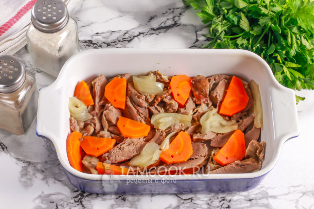 За это время срежьте с отварного сердца верхние сосуды, нарежьте сердце на части вместе с овощами. Выложите нарезки в глубокую емкость.