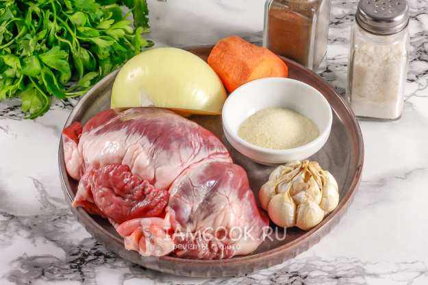 Подготовьте необходимые ингредиенты для вкусного заливного из свиного сердца с желатином. Свиное сердце надрежьте пополам и раскройте, как книжку. Промойте водой все сосуды, удаляя оставшуюся в них кровь. Можно нарезать субпродукт на части.