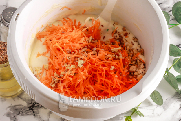 Выложите натертую морковь и раскрошите в руках ядра грецких орехов. Вмешайте все в тесто. Если любите маслянистые бисквиты, то влейте 2-3 ст.л. растительного масла без запаха и вмешайте его.