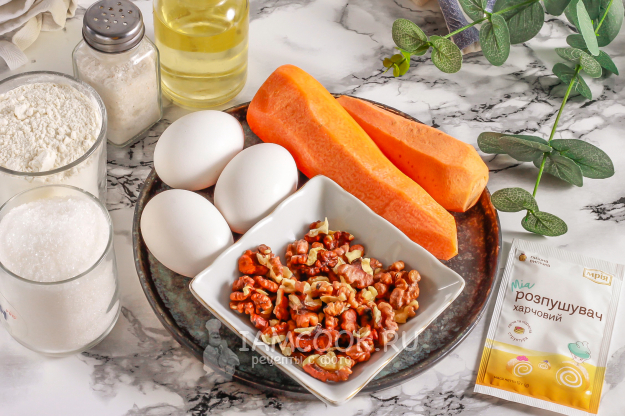 Подготовьте необходимые ингредиенты для морковного бисквита с грецкими орехами.