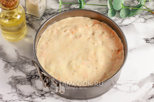 Разогрейте духовку до 180 градусов. Смажьте форму для выпекания растительным маслом и выложите в нее морковное тесто.
