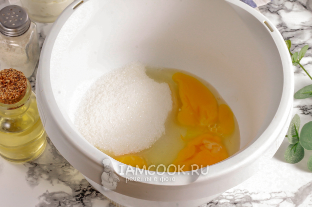В емкость миксера или кухонного комбайна вбейте куриные яйца, всыпьте соль и сахарный песок. Взбейте все в течение 3-5 минут на высокой скорости техники.
