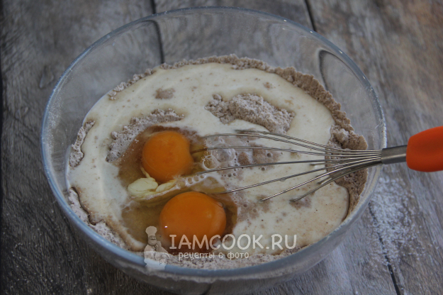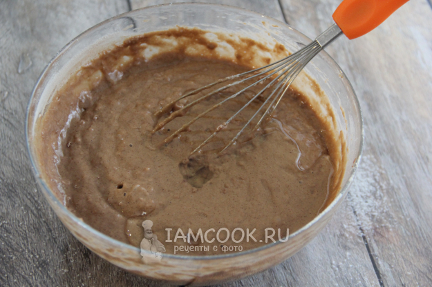 Перемешать тесто венчиком до однородного состояния. Влить масло и ещё раз перемешать.