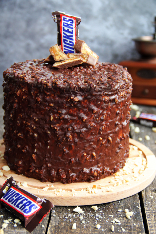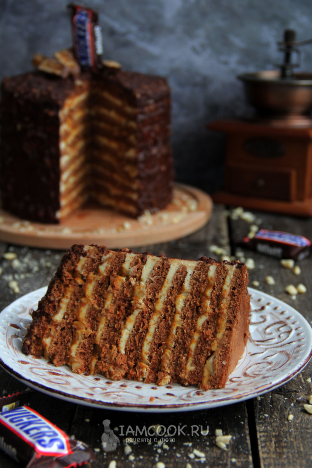 Как видите, Торт Сникерс на сковороде получается очень аппетитным. Разрез торта просто потрясающий, ровный и красивый.