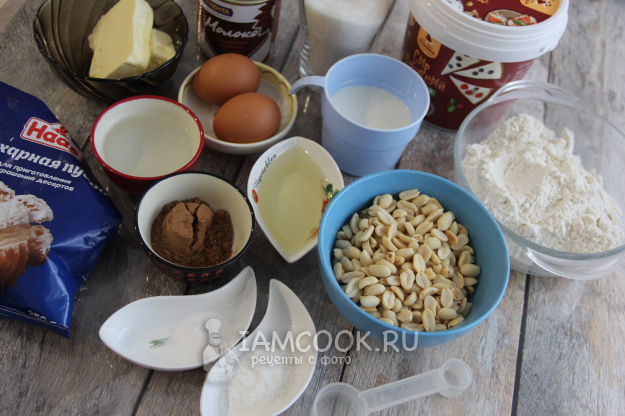 Возьмите продукты для приготовления торта Сникерс на сковороде.