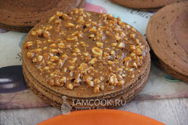 Перевернуть корж с ореховой начинкой на крем чиз. Так в прослойке получится и крем чиз, и карамельно ореховая начинка. Таким образом собрать весь торт.