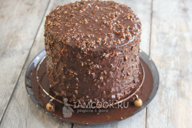 Торт поставить на решетку и подставить тарелку, куда будет стекать ганаш. Полить торт шоколадным ганашом. Поставить на 15 минут в холодильник, до полного застывания ганаша.