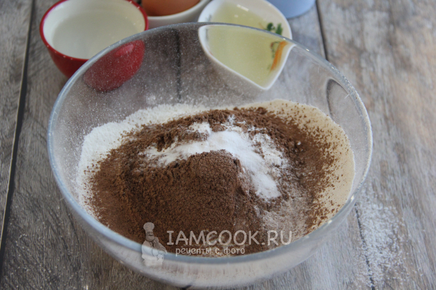 Соединить в миске просеянную муку, соду, разрыхлитель и какао.