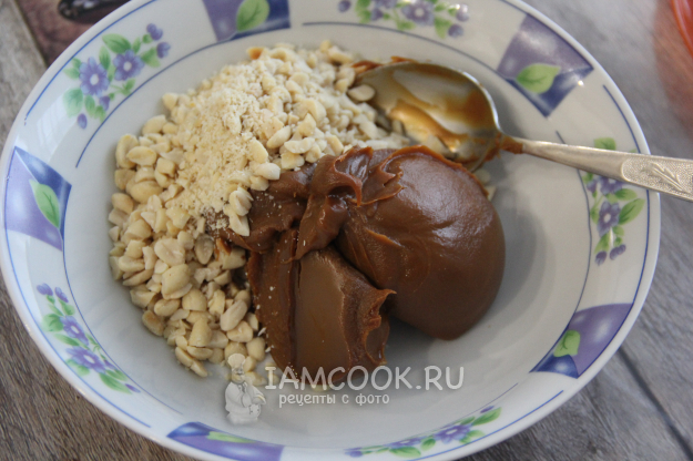 Соленый арахис измельчить в крошку и добавить в шоколадную массу.