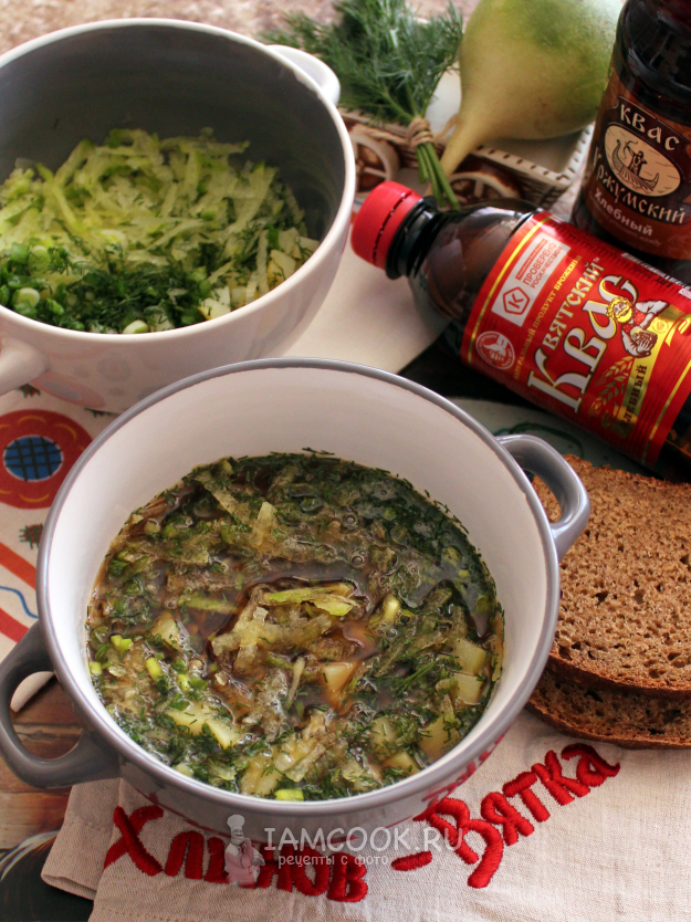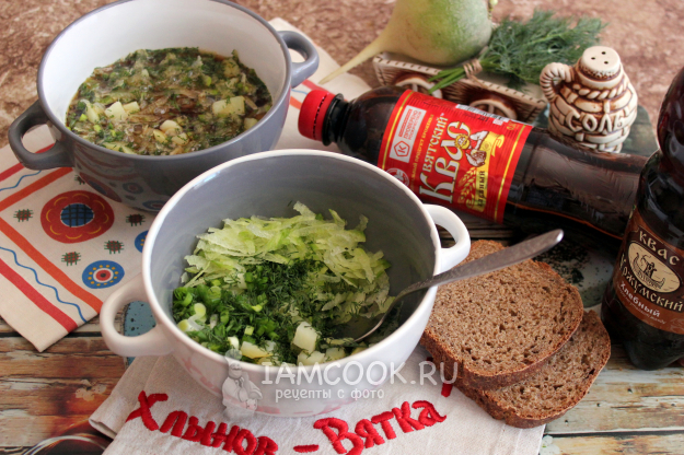 Влейте охлажденный квас, и постная окрошка по-вятски готова.