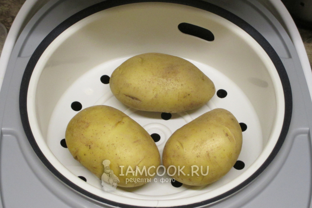 Картофель для окрошки нужно заранее сварить «в мундире» просто в воде в кастрюле или на пару. Мне больше нравится на пару, например в мультиварке в течение 25-30 минут, в зависимости от размеров клубней. Картофелю надо дать остыть, чтобы он стал нужной структуры. Хотя... сойдет и теплый, а вот горячий – нет, его проблематично очистить.