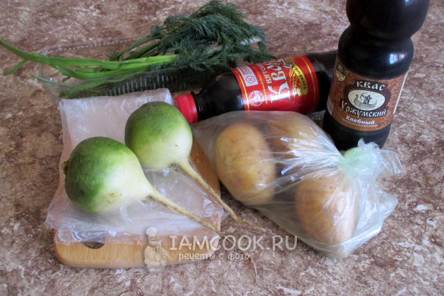 Для постного варианта окрошки по-вятски подготовьте основные ингредиенты по списку и по желанию продукты из дополнительного списка. Их количество может варьироваться, а указано ориентировочное количество.