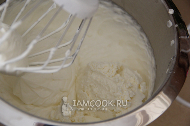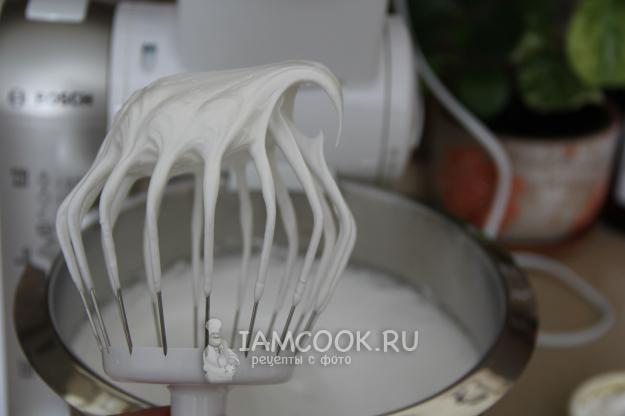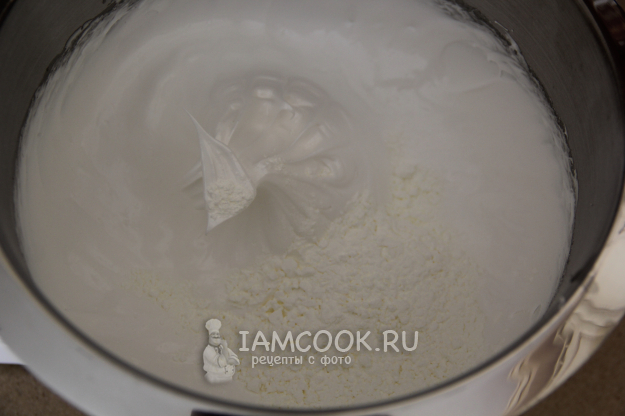 Взбить массу до пышного состояния, всыпать сахар в несколько приёмов и взбивать 10 минут.