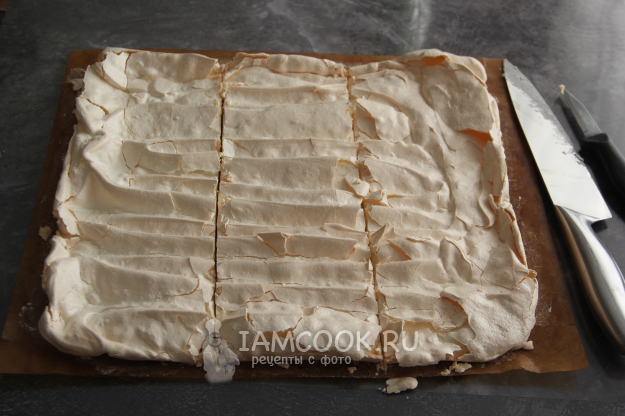 Остудить корж на коврике, а затем разрезать на три полоски.