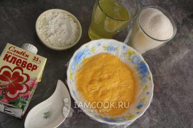 Я в начинку использовала апельсиновый курд, который приготовила заранее. В кастрюле соединить сок, сахар, желтки и крахмал. Перемешать венчиком и поставить на огонь. Довести массу при помешивании до кипения и после первых бульков снять с огня. Добавить масло, перемешать и накрыть пленкой в контакт. Полностью остудить.