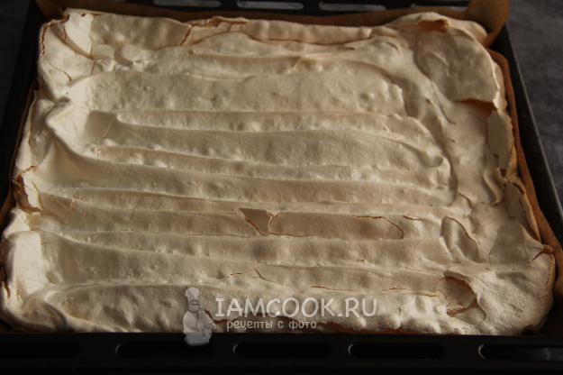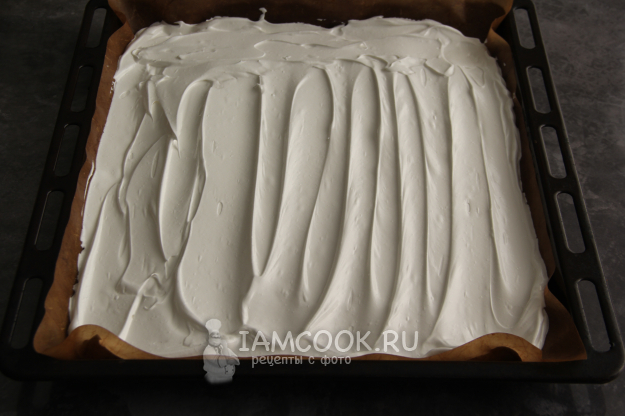 Противень застелить тефлоновым ковриком и выложить белковую массу. Разровнять.