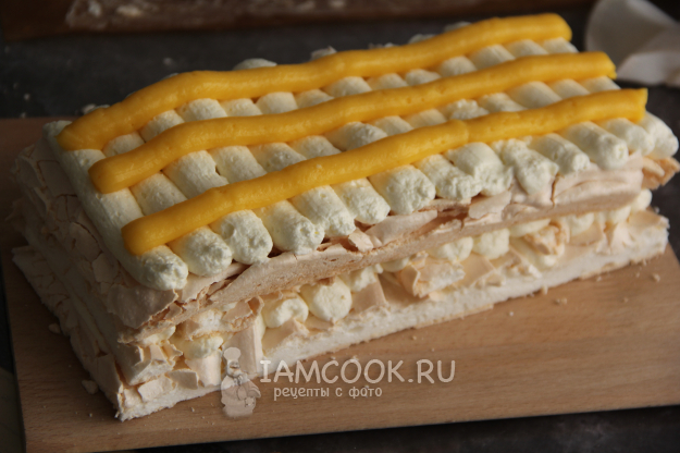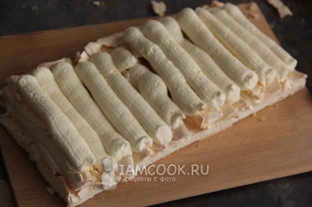 На корж выложить крем. Я наносила полосками из кулинарного мешка.