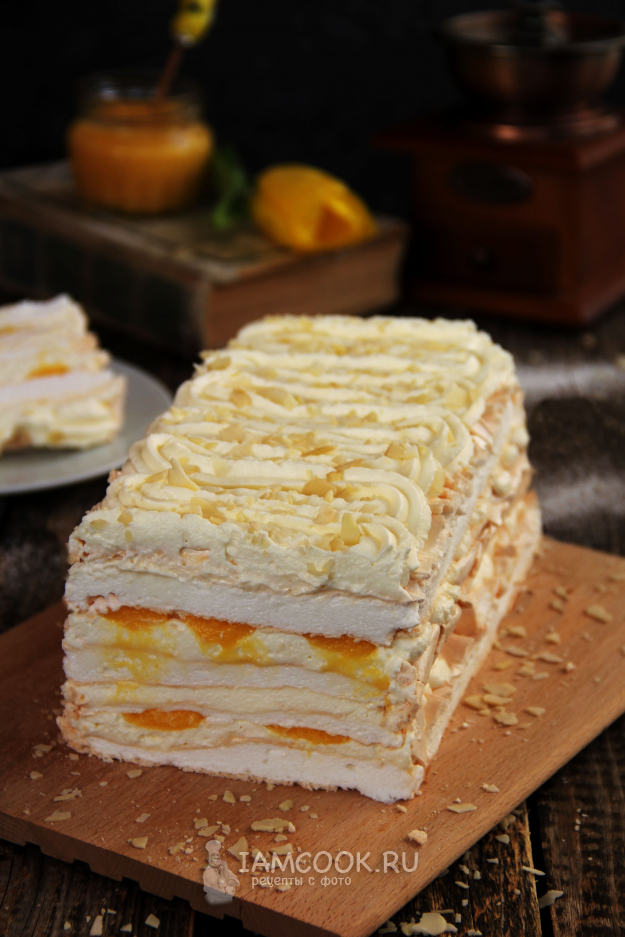 Нанести рифленую змейку поверх коржа. По желанию присыпать миндальными лепестками. Подать меренговый торт к столу. Посмотрите, какие воздушные коржи! Очень нежный и вкусный торт получился.