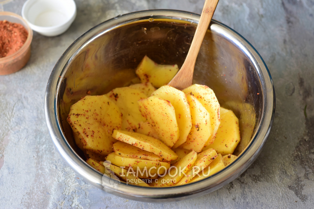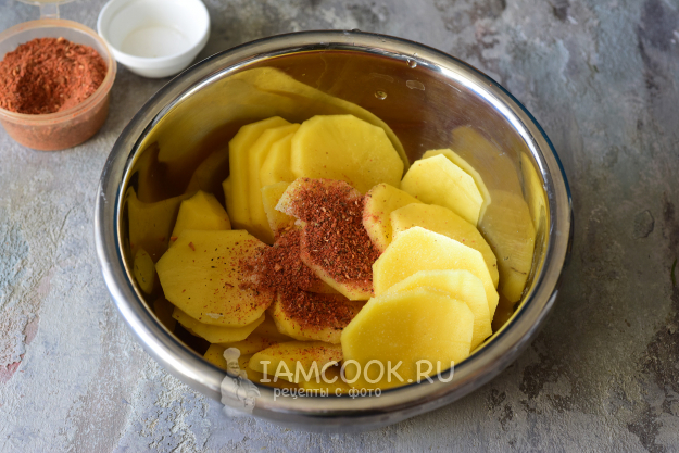 Картофель почистим и помоем. Нарежем тонкими ломтиками, выложим в миску, выдавим чеснок через пресс, добавим соль и специи.