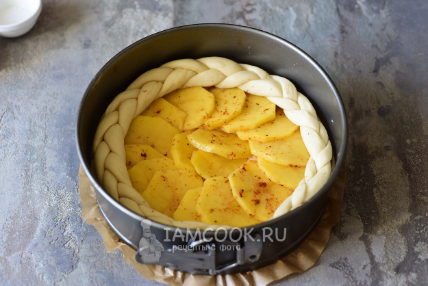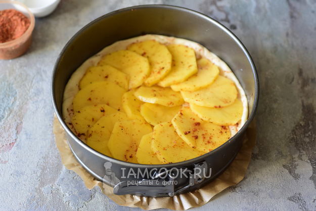 Большую часть раскатаем скалкой в форме круга, соответствующего по размеру диаметру формы для выпекания. Раскатанное тесто выложим на дно формы. Картофельные ломтики выложим на тесто, немного их вдавливая.