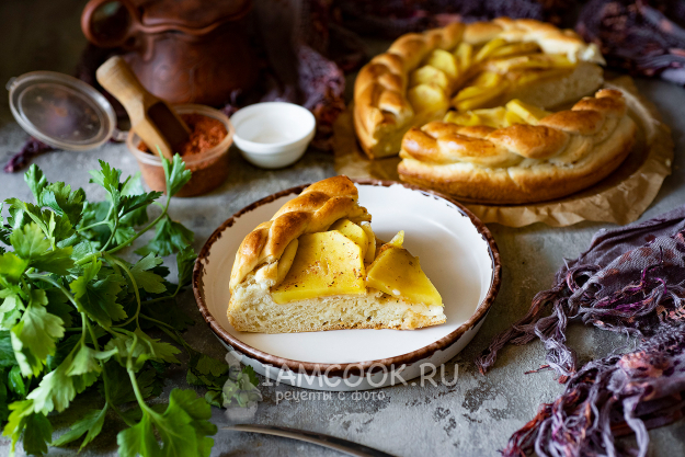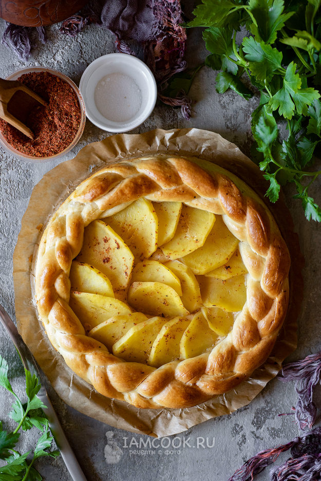 Готовый открытый дрожжевой пирог с картошкой охладим и подадим к столу.